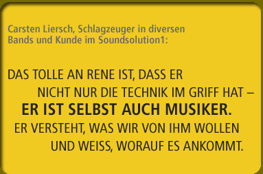 René Schulte, Gründer und Inhaber des Soundsolution1, Jahrgang 72, macht selbst seit 1986 Musik. Zunächst als Schlagzeuger und Sänger in diversen Bands tätig (Duplex D, G-Reizzt, Project4). Heute ist er Sänger bei Vampire und singt auch für Studiojobs.