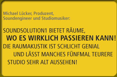 Auch Räume klingen! Und nicht nur das verwendete Equipment oder die Instrumente. Erst die Umgebung bringt das alles auch zum Klingen. Daher wurde bei der Einrichtung von Soundsolution 1 auf eine bestmögliche Klangcharakteristik der Räume geachtet: Erbaut mit Lehm und Holz, Raum in Raum; zur Verhinderung von stehenden Wellen wurden parallele Wände vermieden. Außerdem gibt es verschiedene Reflektionsflächen sowie 4 sehr effektive Stellwände.
